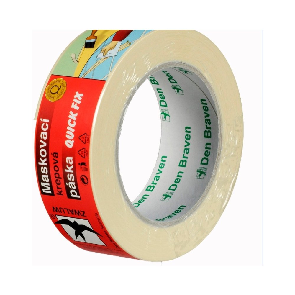 Maskovací krepová páska, k jednodennímu použití. Nedoporučuje se na krytí okenních rámů. Pro tyto účely použijte UV pásky. Pro ochranu různých povrchů ve stavebnictví a v průmyslu před potřísněním ploch nebo mechanickým poškozením. Používá se při lakýrnických, natěračských nebo malířských pracích. Odolná vůči tepelným změnám, barvám a rozpouštědlům. Přilnavá k většině materiálů. Není určena pro dřevěné lakované povrchy. Pásku je nutno odstranit do 24 hodin po nalepení z důvodu zamezení ulpění lepidla na povrchu. Nosičem je impregnovaný krepový papír opatřený speciálním souvislým lepivým pryžovým filmem. Tepelná odolnost pásky do +60 °C. Aplikovat pásku je možné v rozsahu 0°C až +40°C. |