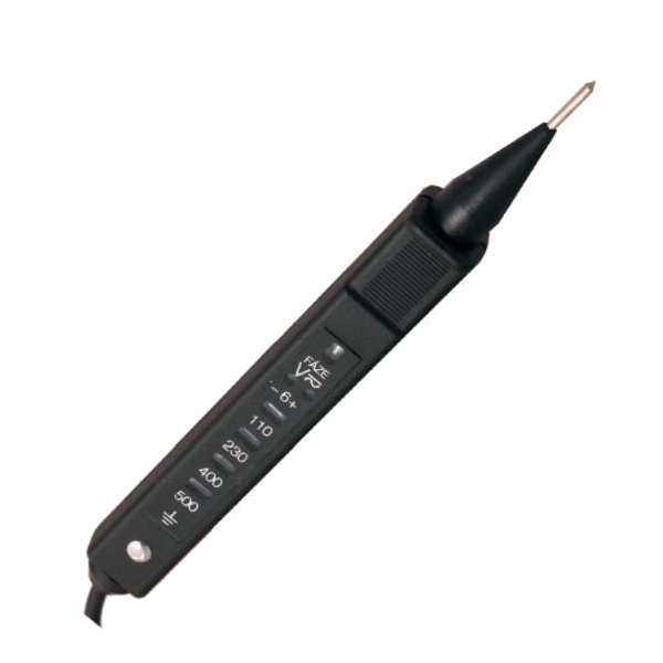 Zkoušečka ZNF-95 je určena ke kontrole napětí 6-500V střídavých (50 Hz) i stejnosměrných, určení fázového vodiče, pořadí fází třífázové soustavy a polarity stejnosměrného napětí. Měření napětí je orientační. U střídavého napětí se rozsvítí obě červené LED diody již od 4,5V. Vyšší rozsahy pro střídavé napětí se rozsvítí vždy při dosažení napětí jmenovitého, tj. 110, 230, 400 a 500V. Zbývající stejnosměrné rozsahy jsou určeny k orientační kontrole velikosti měřeného napětí. Dvojice červených LED diod určuje polaritu napětí na hrotu tělesa zkoušečky (pevném). Když svítí LED dioda označená symbolem "+", je na pevném hrotu kladné napětí (když "-", záporné napětí). Pokud svítí obě, napětí je střídavé. Zkoušečka není konstruována pro trvalé měření. Na rozsahu 380 a 500V měřit do 1 minuty. Na ostatních rozsazích max. 3 min. |