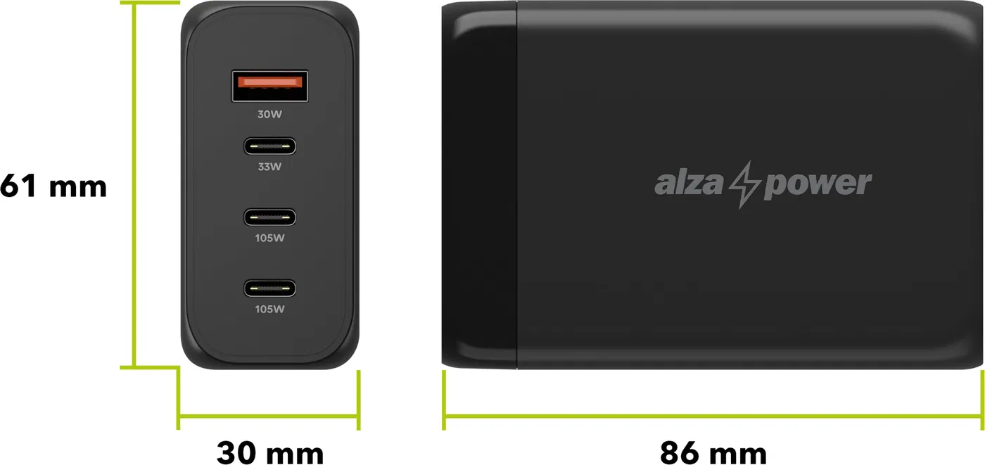 Celkový výkon: 130 W Výkonná nabíječka se čtyřmi výstupy pro nabíjení notebooků, tabletů, telefonů a všeho co se nabijí pomocí USB Čistý a miniaturní design Každý port má vlastní čip – neodpojí napájení při připojení dalšího zařízení Technologie GaN (Gallium Nitride) – umožňuje vyšší výkon a účinnost při zachování kompaktních rozměrů Podpora rychlého nabíjení: Power Delivery 3.0 s PPS, Qualcomm Quick Charge 4.0+, Samsung Adaptive Fast Charge, Huawei Super / Fast Charge Protocol, Apple 2.4A, USB Battery Charging 1.2 a MediaTek Pump Express 2.0 Umožňuje až 20× rychlejší nabíjení oproti konvenčnímu USB nabíjení Bezpečnostní ochrany 4safe: proti přepětí, přetížení, přehřátí a zkratu Vysoce efektivní vestavěný PMIC (Power Management Integrated Circuit) umožňující fungování v mezích vstupního napětí od 100 do 240 V Smart IC – automatická detekce připojeného zařízení a optimální distribuce výkonu Vstupní napětí: 100–240 V ~ 50/60 Hz Výstupy: Délka napájecího kabelu v balení: 1 metr, možnost nahradit jinou délkou s standardním konektorem IEC C7 Účinnost: více než 86 % Materiál: hliník Spotřeba bez zátěže: 0,08 W Rozměry: 61 × 30 × 86 mm Hmotnost: 220 gramů (+ 60 gramů napájecí kabel) Provozní teplota: -10 až 40 °C Provozní vlhkost: 5 až 90 % Skladovací teplota: -20 až 80 °C Skladovací vlhkost: 0 až 95 % Certifikace: CE, EMC, LVD a RoHS |