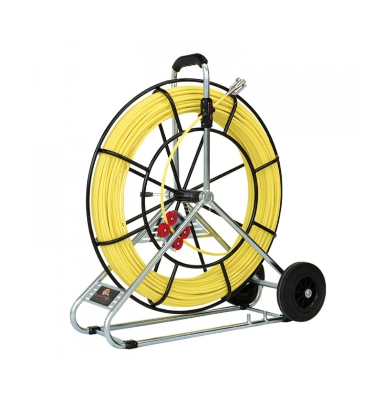 Protahovací pero ze skelného vlákna Ø 9 mm, včetně pojízdného nerezového navíjecího stojanu Ø 730 mm, závit RTG Ø 12 mm. Včetně příslušenství (1x pojízdný stojan, 1x počítadlo metrů, 1x karabinka, 1x pero s čepy na obou stranách).