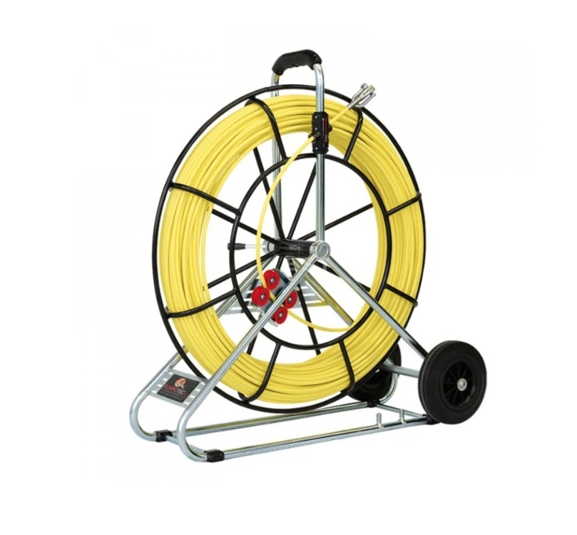 Protahovací pero ze skelného vlákna Ø 11 mm, včetně pojízdného nerezového navíjecího stojanu Ø 1000 mm, závit RTG Ø 12 mm. Včetně příslušenství (1x pojízdný stojan, 1x počítadlo metrů, 1x karabinka, 1x pero s čepy na obou stranách).