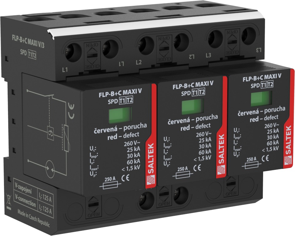 kombinovaný svodič bleskových proudů a přepětí, vhodné pro 3-fázový systém TN-C, instalace na vstupu do budovy, 75 kA (10/350), 180 kA (8/20)