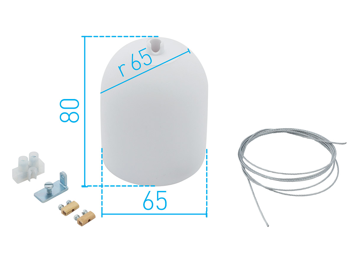 Ocelové lanko 1,1m, lankové svorky, kovový jezdec do drážky tubusu, plastová krytka na strop v bílé nebo stříbrné barvě.